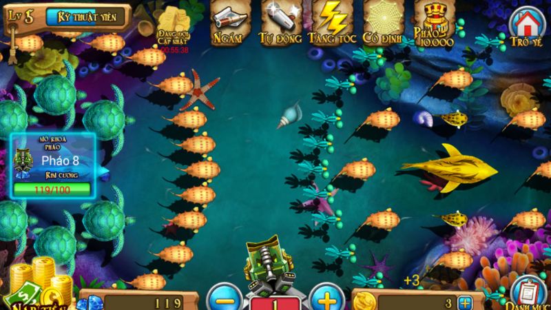 Ngoài các loài cá thông thường,game còn cung cấp các phần thưởng cực kỳ hấp dẫn từ các loài cá đặc biệt và trùm khủng. Đặc biệt, việc hạ gục các trùm lớn như cá voi hay rồng vàng sẽ mang lại những điểm số và phần thưởng cực kỳ giá trị, khiến trò chơi trở nên kịch tính hơn bao giờ hết.